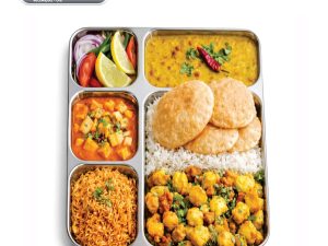 - 5-Compartment Meal Design: One large section with four deep compartments keeps dal, sabzi, rice, roti, and desserts neatly separated.