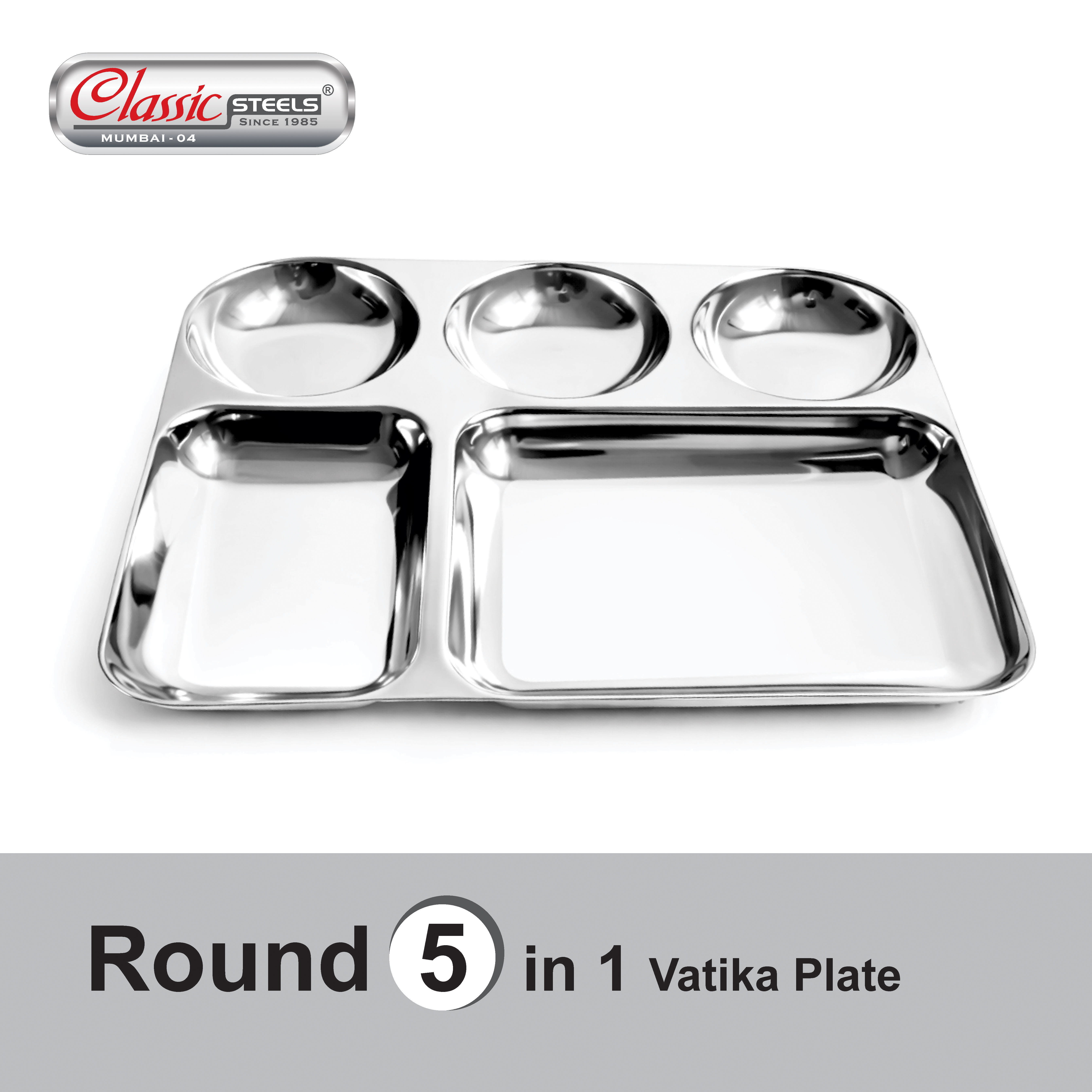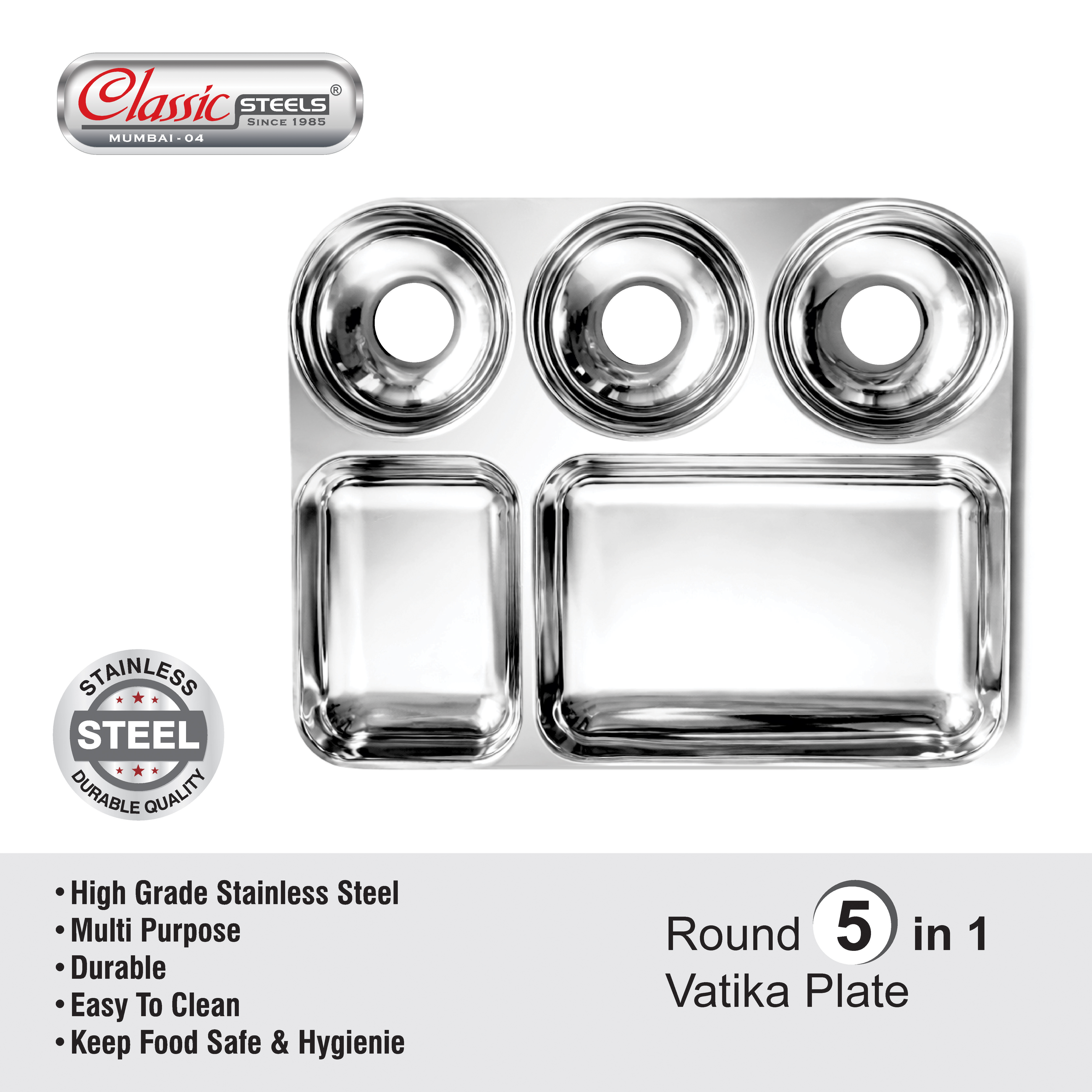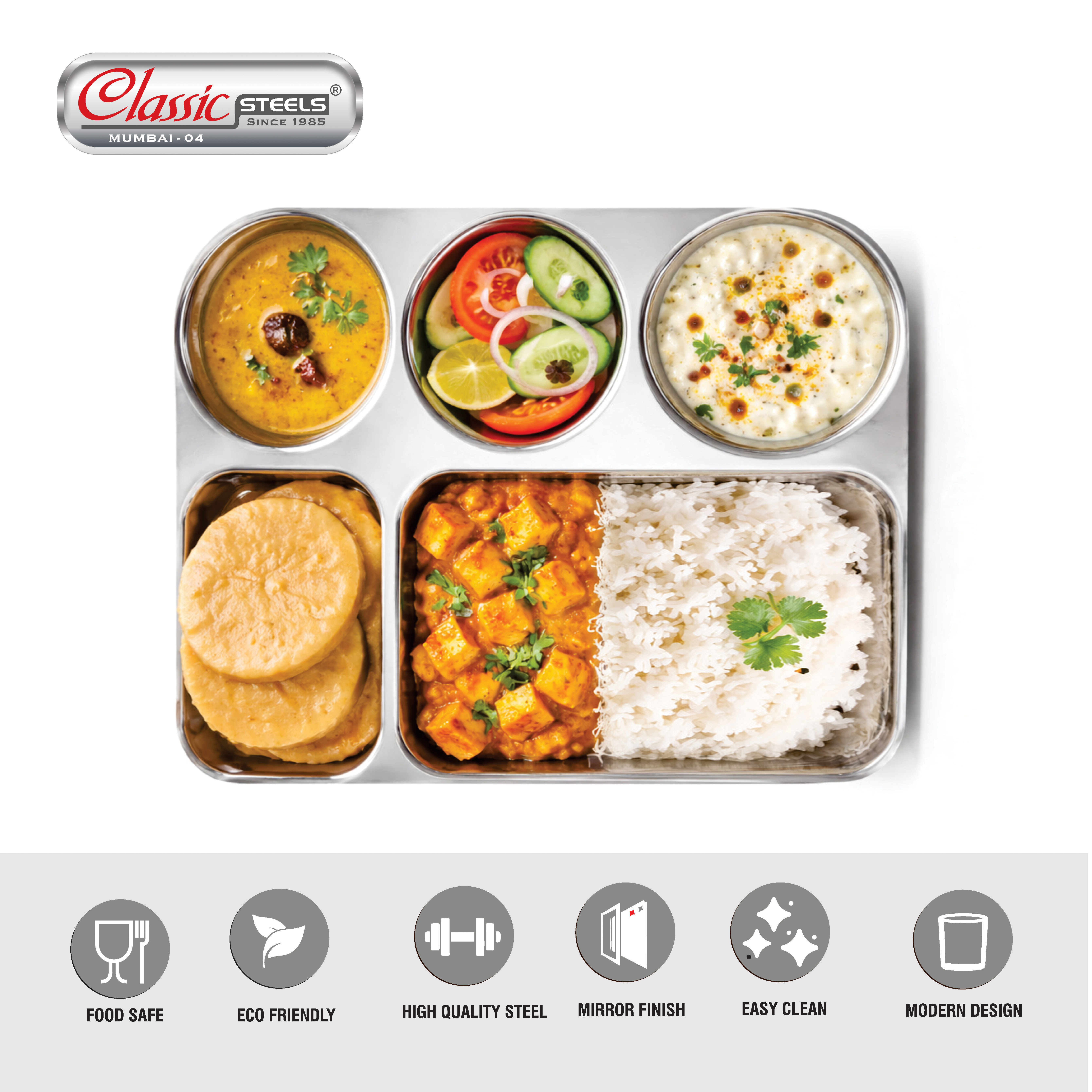 - Complete 5-in-1 Meal Solution : Enjoy traditional dining with a 5-in-1 round bhojan thali featuring multiple compartments for serving dal, sabzi, roti, rice, and desserts in one organized plate. Ideal for balanced meals at home, hotels, hostels, and catering services.