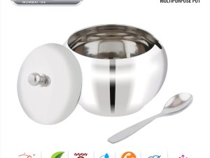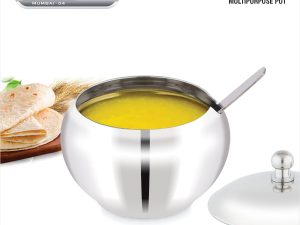 • 𝐏𝐫𝐞𝐦𝐢𝐮𝐦 𝐒𝐭𝐚𝐢𝐧𝐥𝐞𝐬𝐬 𝐒𝐭𝐞𝐞𝐥 𝐁𝐮𝐢𝐥𝐝 – Made from food-grade stainless steel, this ghee dani with spoon is jointless, rust free, and toxin free. durable for everyday use in the kitchen or during pooja rituals.