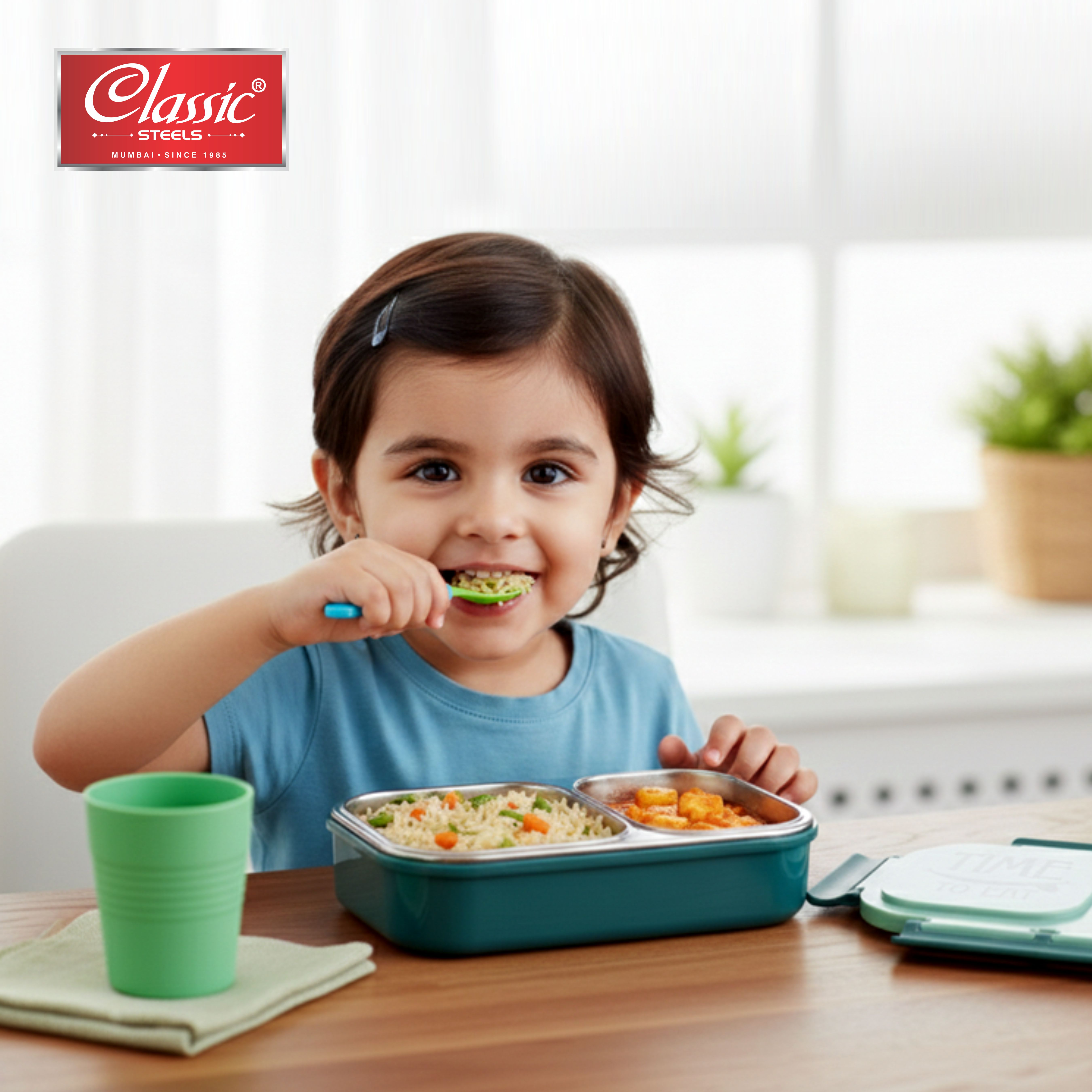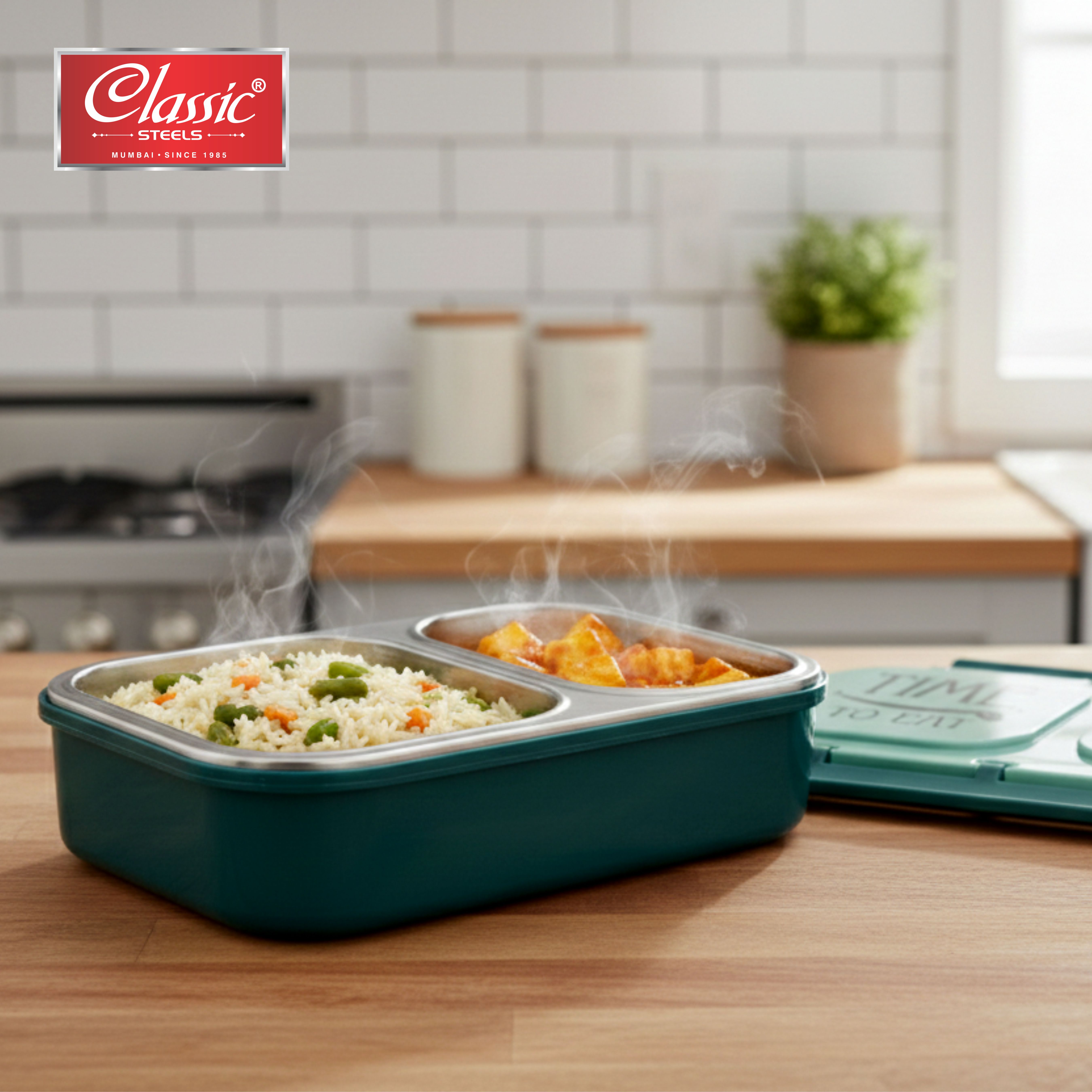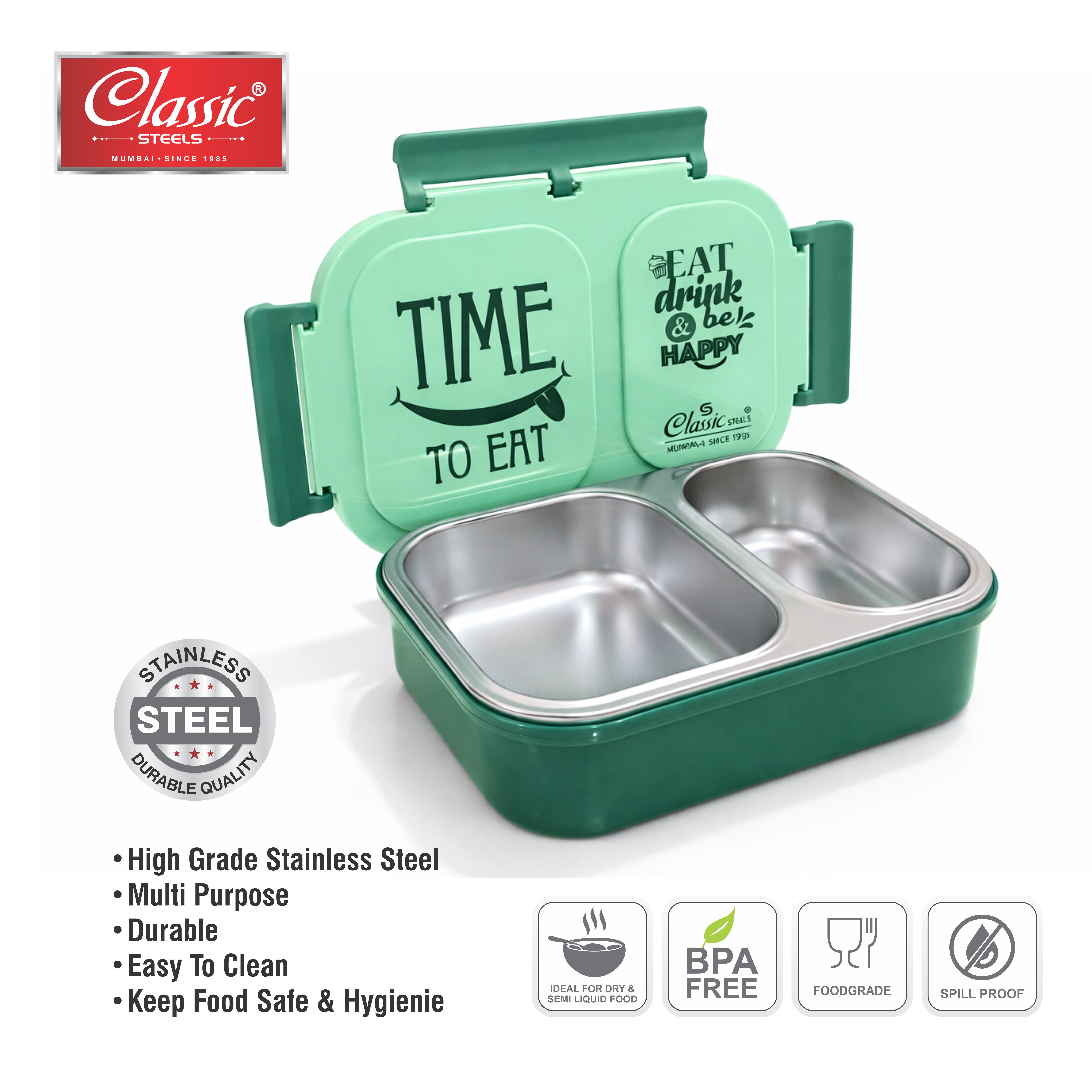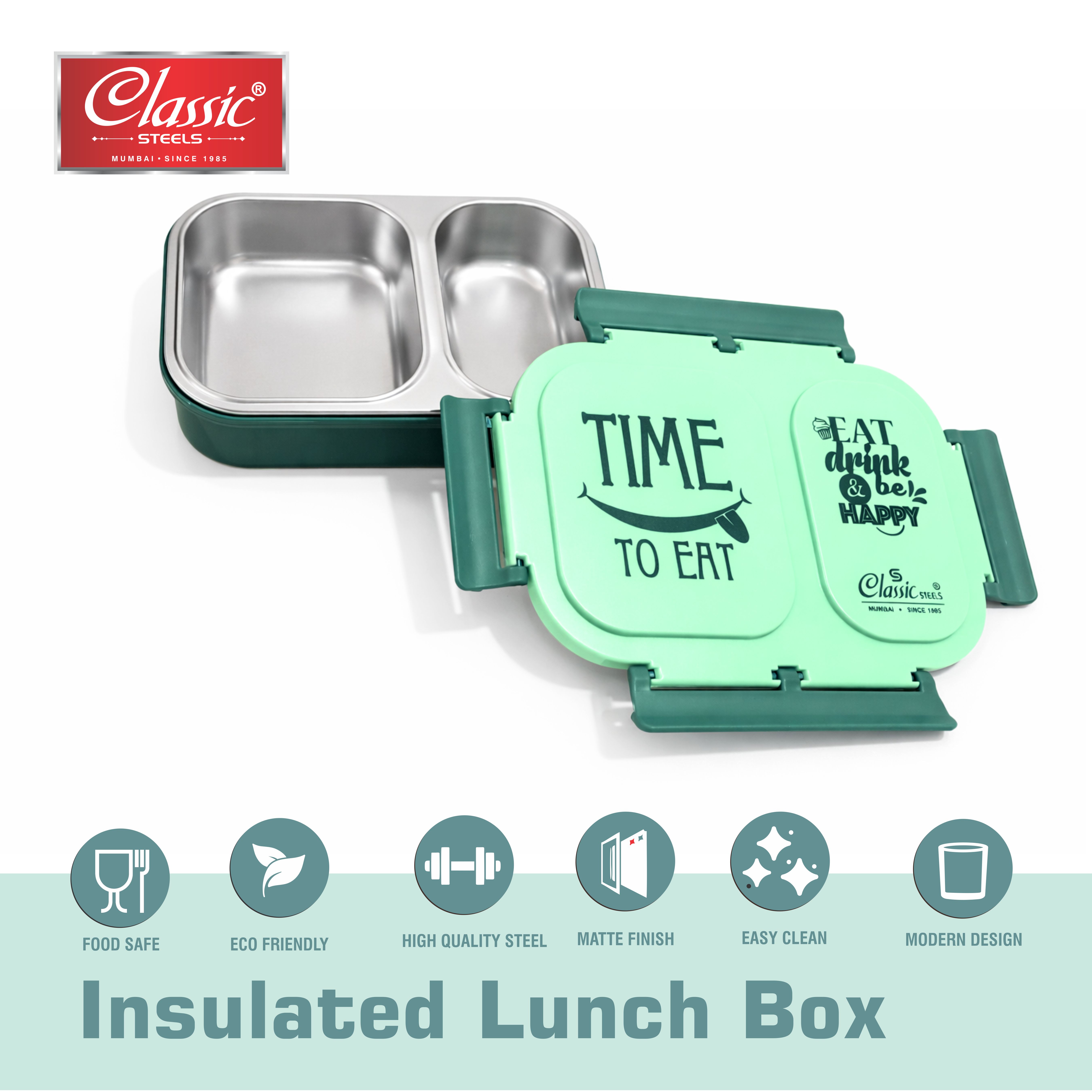 Classic Steels Bento Duo Lunch Box for Kids (600ml) | 2 Compartments Stainless Steel Insulated Tiffin Box | Leak-Proof Silicone Seal | School Lunch Box | Green