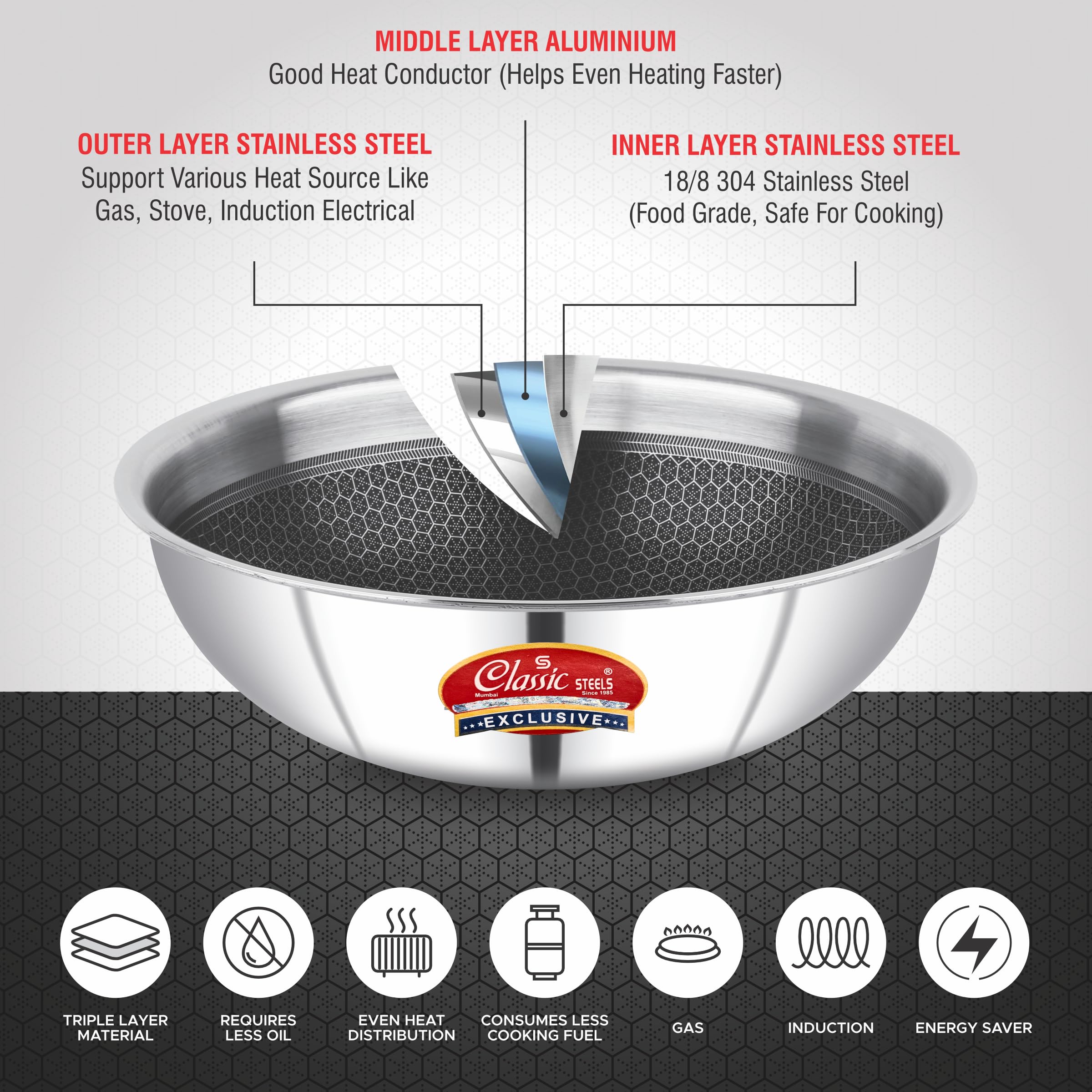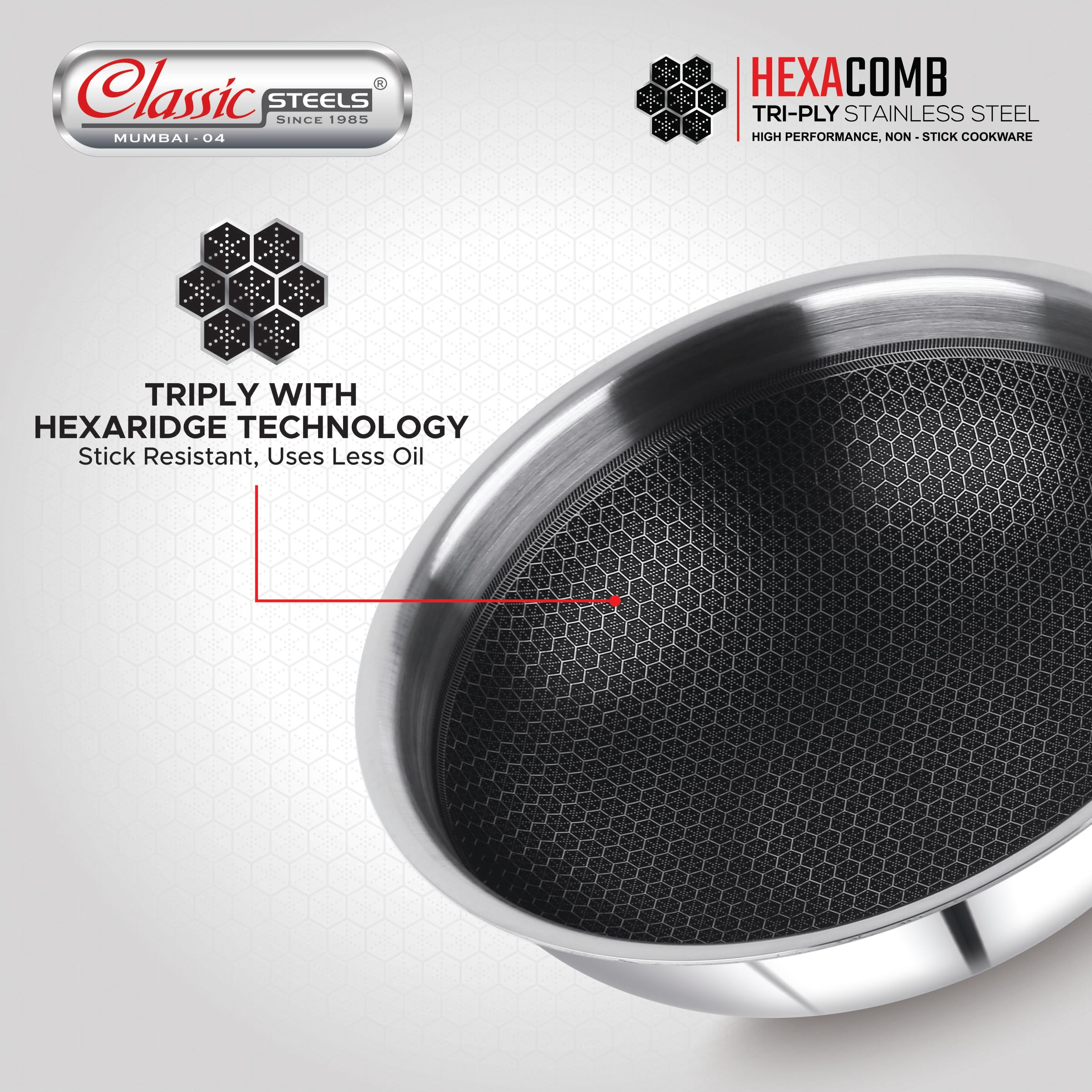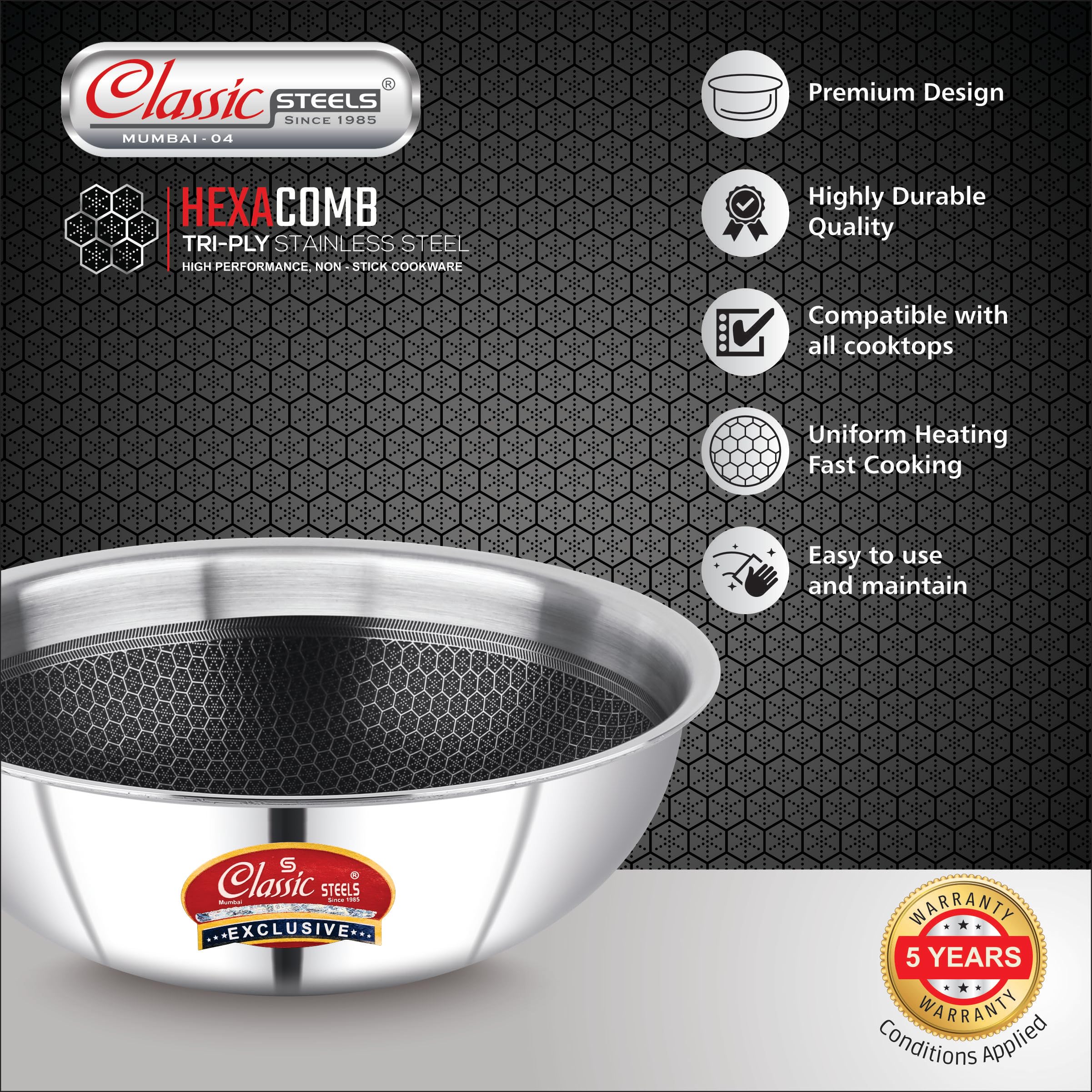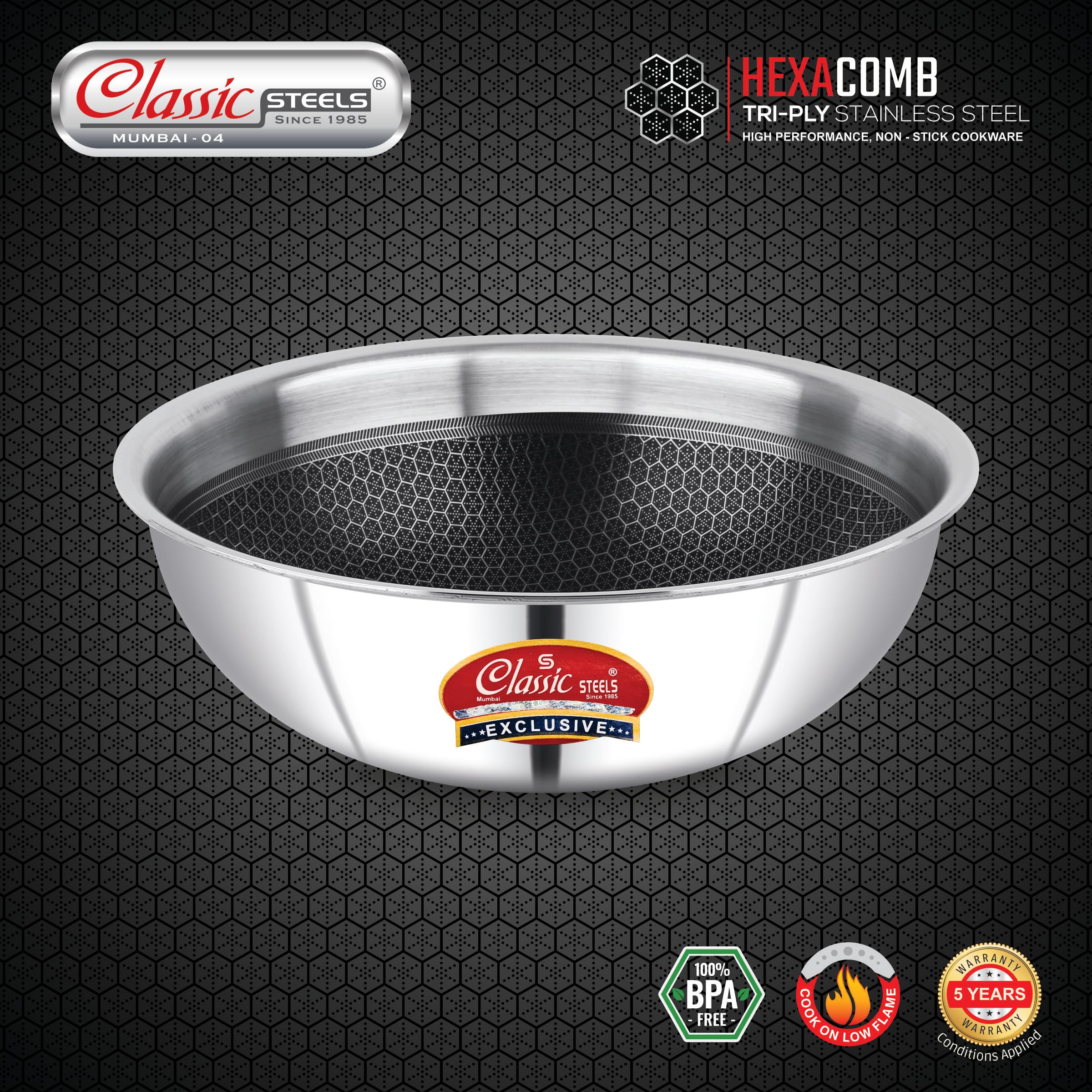 - Hexa comb tasla triply kadhai tasra stainless steel cookware silver non stick gas stove induction base thick base kitchen utensil food grade rust resistant easy clean indian cooking