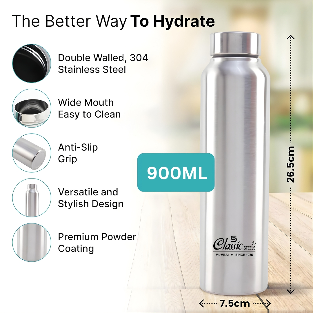 Elevate your daily hydration with the Classic Steels 900ml Stainless Steel Water Bottle, a perfect blend of durability and sophisticated design. Engineered for those who value both form and function, this bottle is crafted from high-grade 304 food-grade stainless steel, ensuring it remains rust-proof, non-toxic, and impact-resistant for years of use.