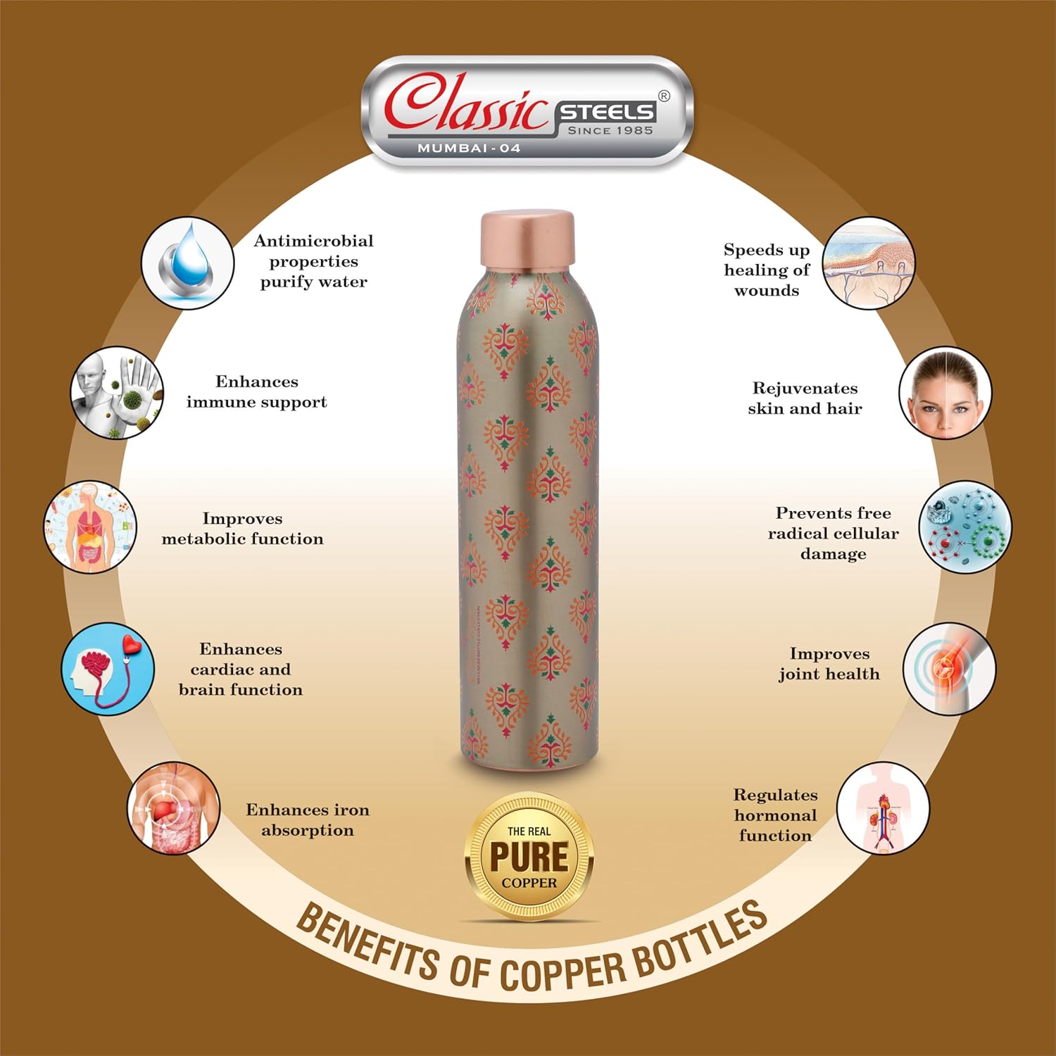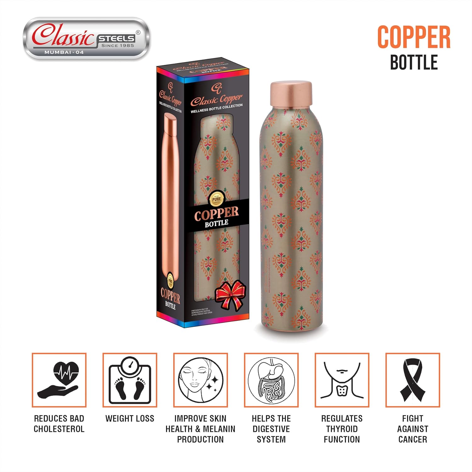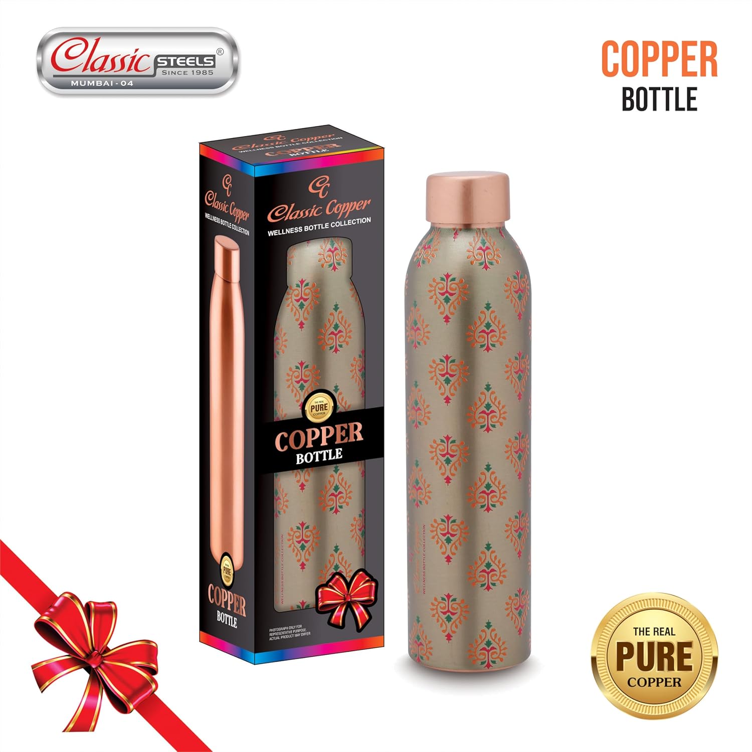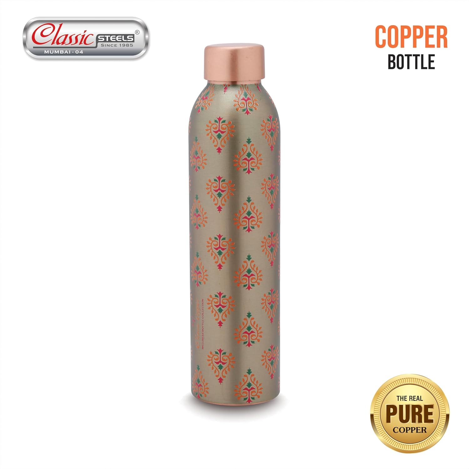- PERFECT FOR OFFICE AND HOME USE: The Classic Steels Copper Bottle 1 Litre Is Ideal For Both Office And Home Environments. Its Sophisticated And Practical Design Makes It A Stylish Addition To Any Desk Or Kitchen Counter. By Keeping This Elegant Bottle Within Reach, You Can Effortlessly Stay Hydrated Throughout The Day While Enjoying The Numerous Health Benefits Associated With Drinking Water Stored In Copper.