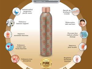 - PURE COPPER FOR OPTIMAL HEALTH BENEFITS: Our Ethnic Green Printed Copper Bottle Is Crafted From 99.6% High-Grade Food-Safe Copper, Ensuring Maximum Antibacterial And Antimicrobial Properties. Copper’s Natural Benefits Make It Ideal For Storing Water, Promoting Health And Wellness By Enhancing Digestion, Improving Skin Health, And Supporting The Immune System.