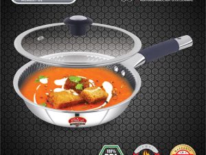 The HEXA COMB Triply Frypan 20cm with Glass Lid is a premium kitchen essential designed for Indian households. Its innovative hexa comb non-stick surface offers superior scratch resistance and excellent food release without harmful chemicals. The sturdy 2.5mm thick base with triply construction (stainless steel + aluminum core) ensures fast and even heating, perfect for frying, sautéing, and cooking a variety of Indian dishes. The included tempered glass lid locks in heat and moisture, allowing you to cook efficiently while keeping an eye on your food. Compatible with gas stoves, induction cooktops, and electric plates, this frypan brings versatility and durability to your kitchen. Made from food-grade stainless steel, it’s easy to clean, rust-resistant, and built to last, making it a must-have cookware for every Indian kitchen.
