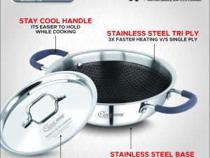 • Premium Triply Construction: Made with 3-layer bonded metal—stainless steel, aluminium, and stainless steel—for faster, even heating and better cooking performance with no hot spots or food burns.