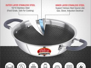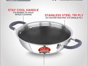 - Triply stainless steel kadai without lid gas induction stove heavy base cookware non stick fry pan for Indian cooking silver honeycomb durable rust resistant easy to clean