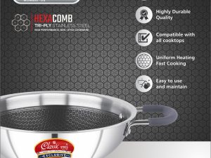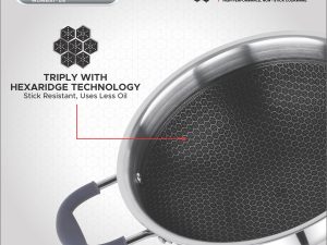 Experience efficient and healthy cooking with the HEXA Comb Triply Stainless Steel Kadai. Designed with a 2.5mm heavy base and a high-performance triply construction (stainless steel–aluminium–stainless steel), this 18cm kadai ensures fast and even heat distribution, saving both time and energy. Perfect for sautéing, frying, or making Indian gravies, this kadai is compatible with both gas stoves and induction cooktops. The silver stainless steel finish adds a touch of elegance to your kitchen, while the honeycomb texture ensures food doesn’t stick easily. Built to last and easy to maintain – it’s the smart choice for modern kitchens.