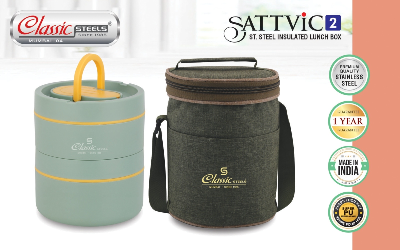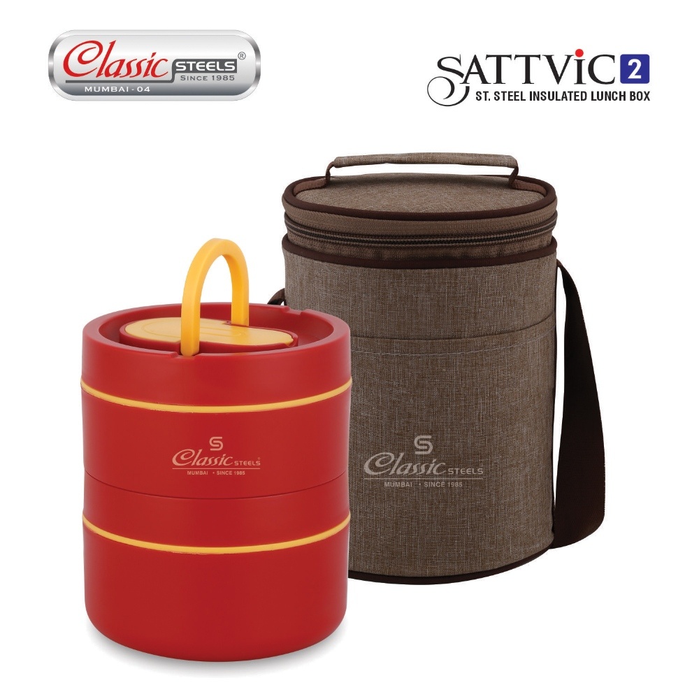 Classic Steels Sattvic Insulated Stainless Steel Lunch Box Container, 550 ml & 1 Container 350 ml, 1 Spoon | Microwave Safe | Leak Proof Air Tight Lunch Box| Keep Your Meal Fresh and Hot Upto 4 Hours