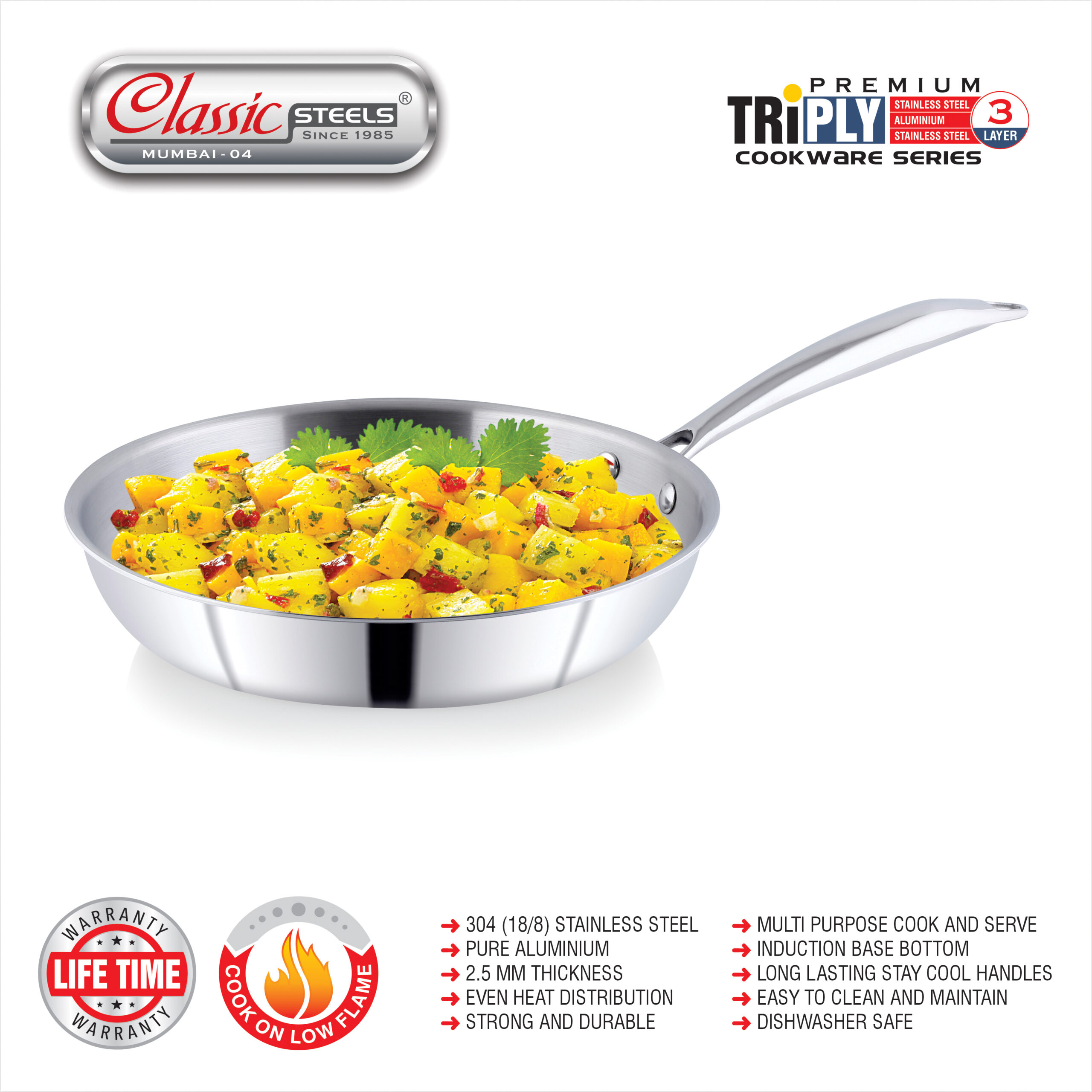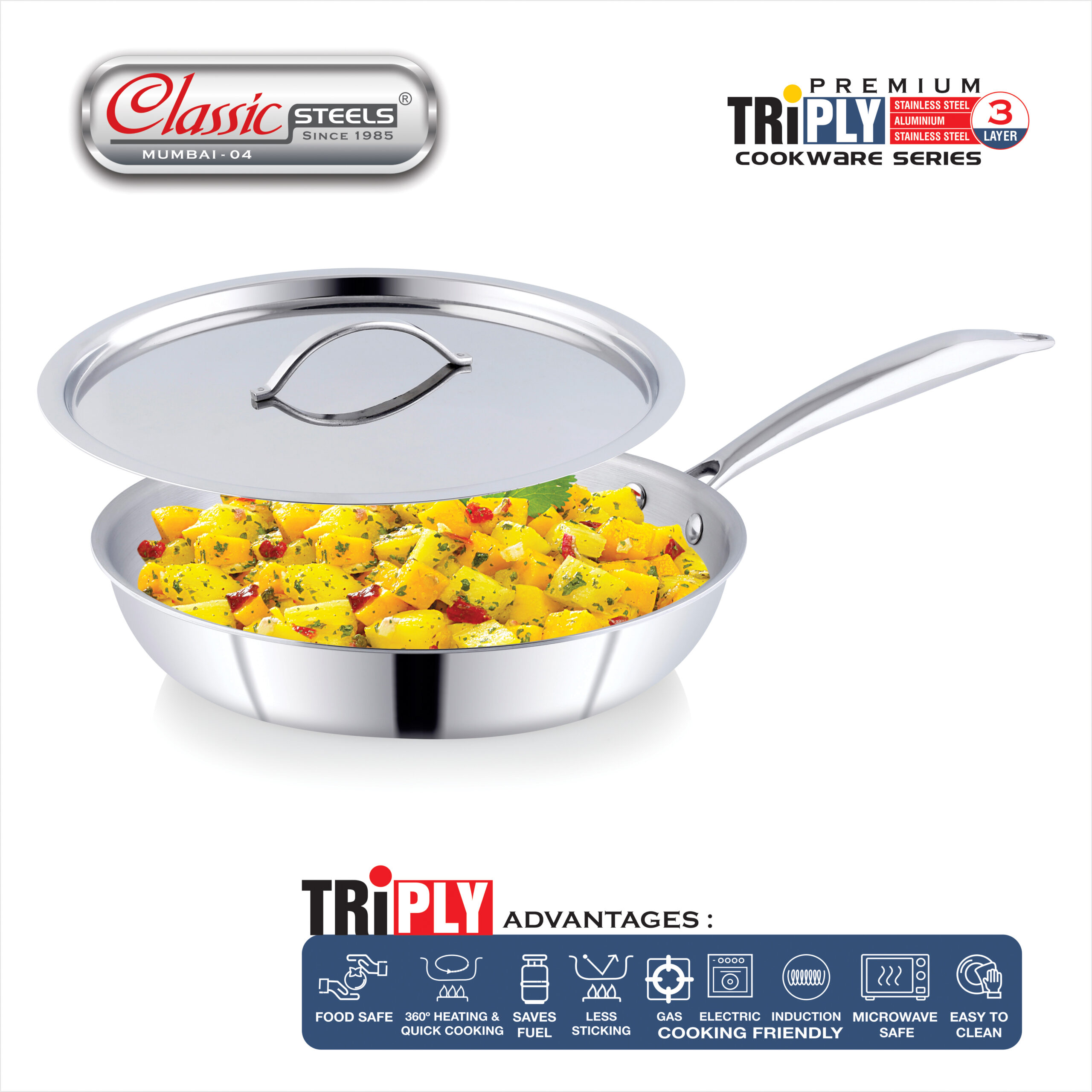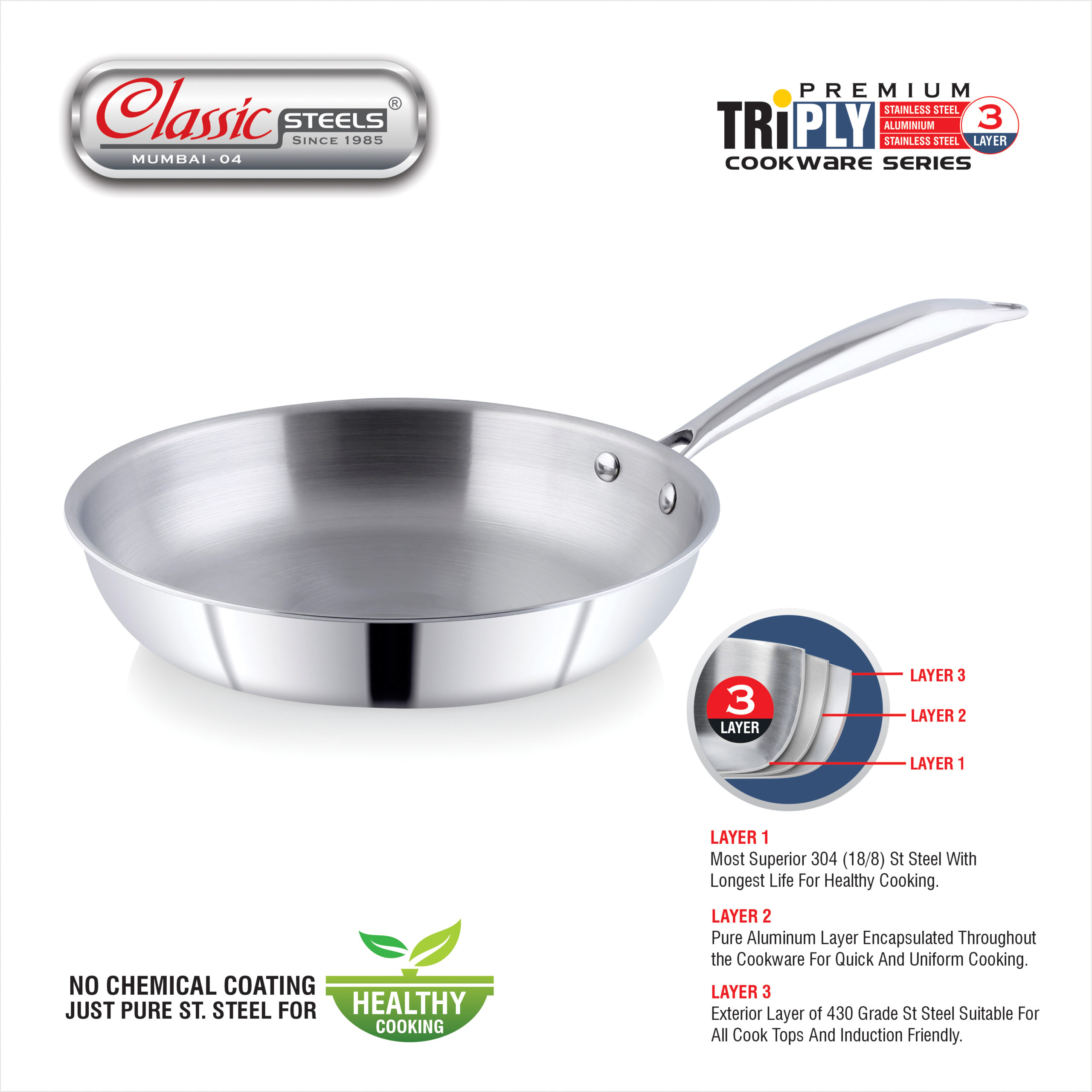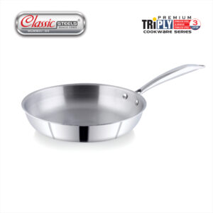 - 𝐏𝐑𝐄𝐌𝐈𝐔𝐌 𝐓𝐑𝐈𝐏𝐋𝐘 𝐂𝐎𝐍𝐒𝐓𝐑𝐔𝐂𝐓𝐈𝐎𝐍 = Crafted with a robust 3-layer body, this triply stainless steel fry pan delivers fast, even heating for consistently perfect results. It brings modern efficiency to everyday Indian cooking traditions.